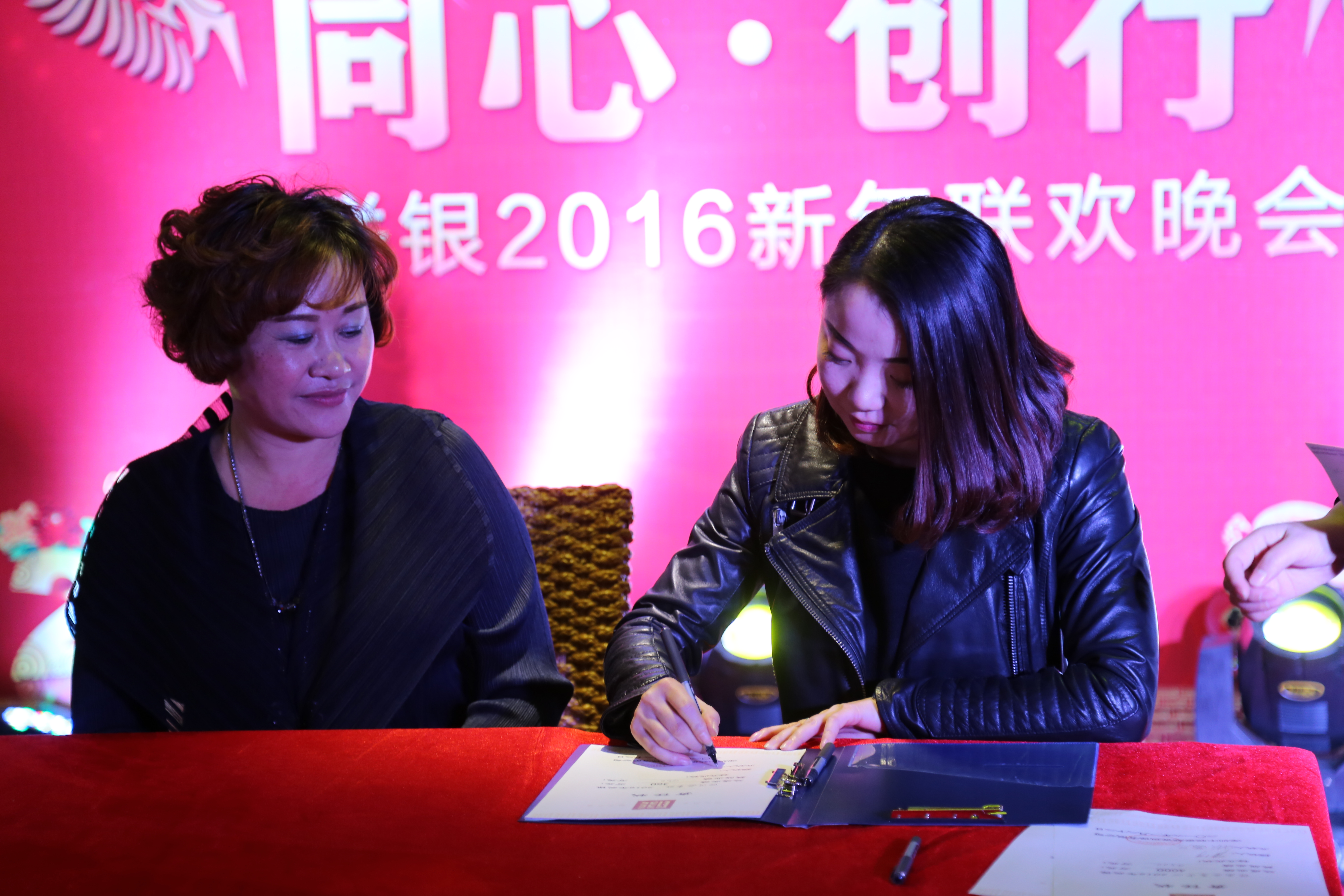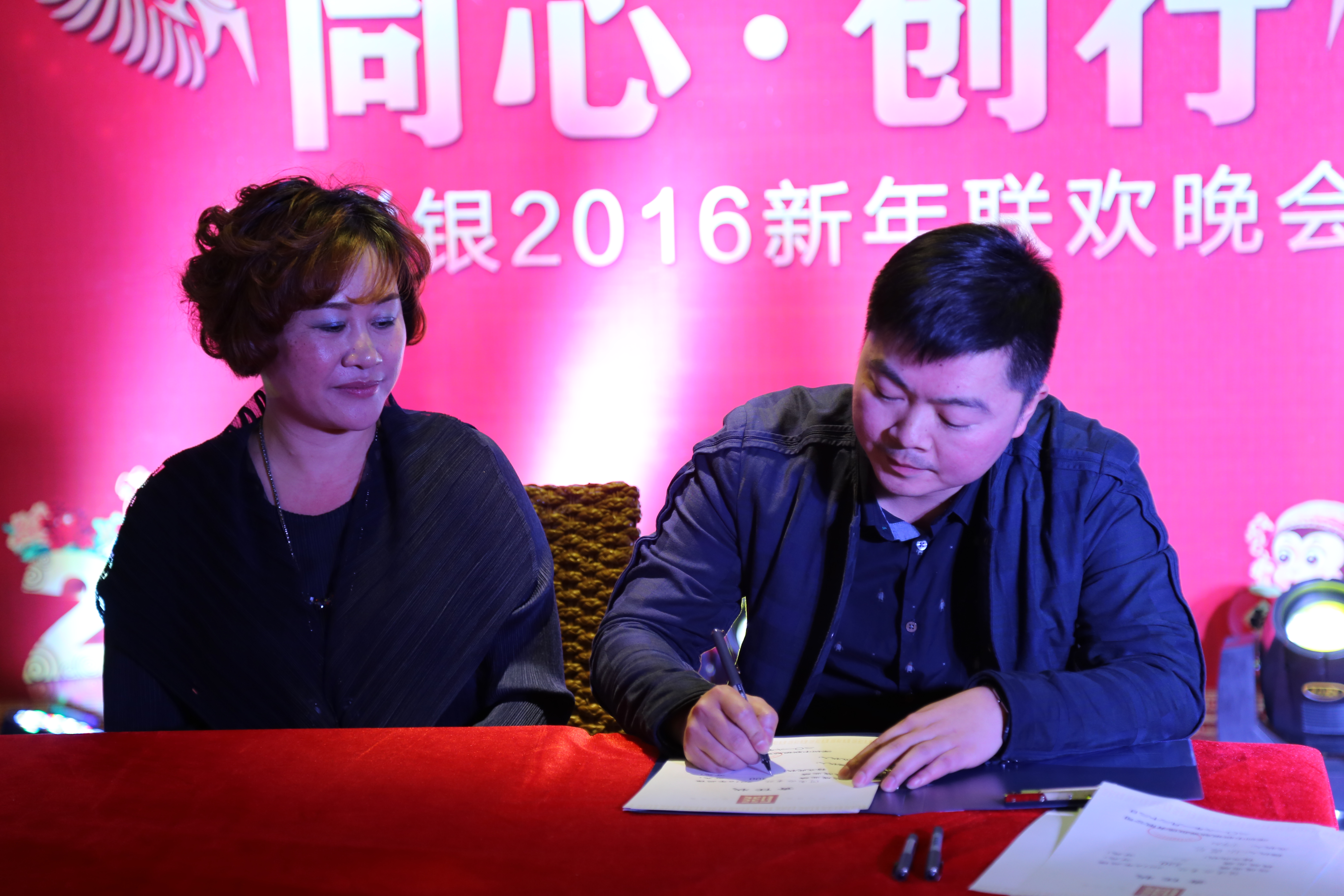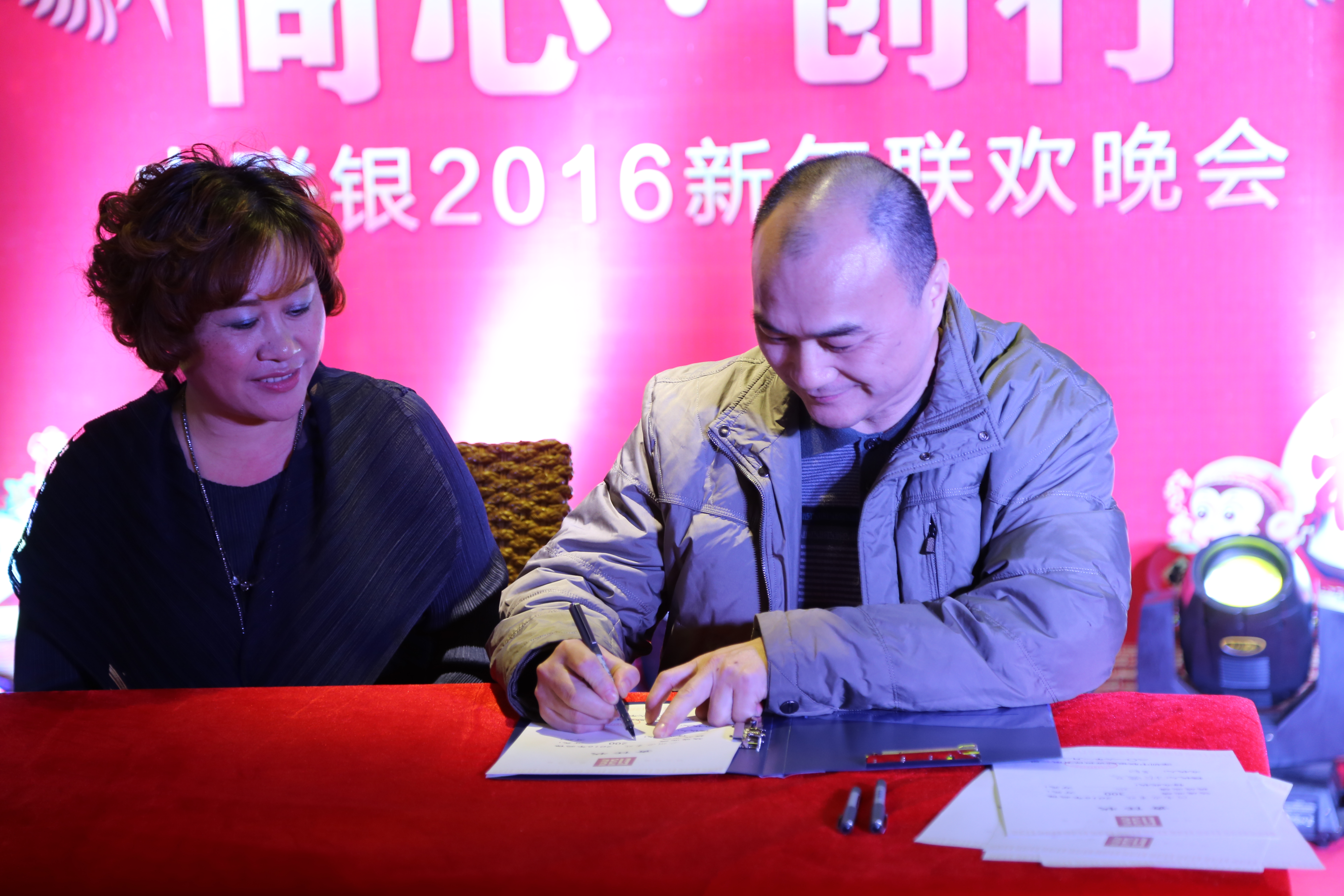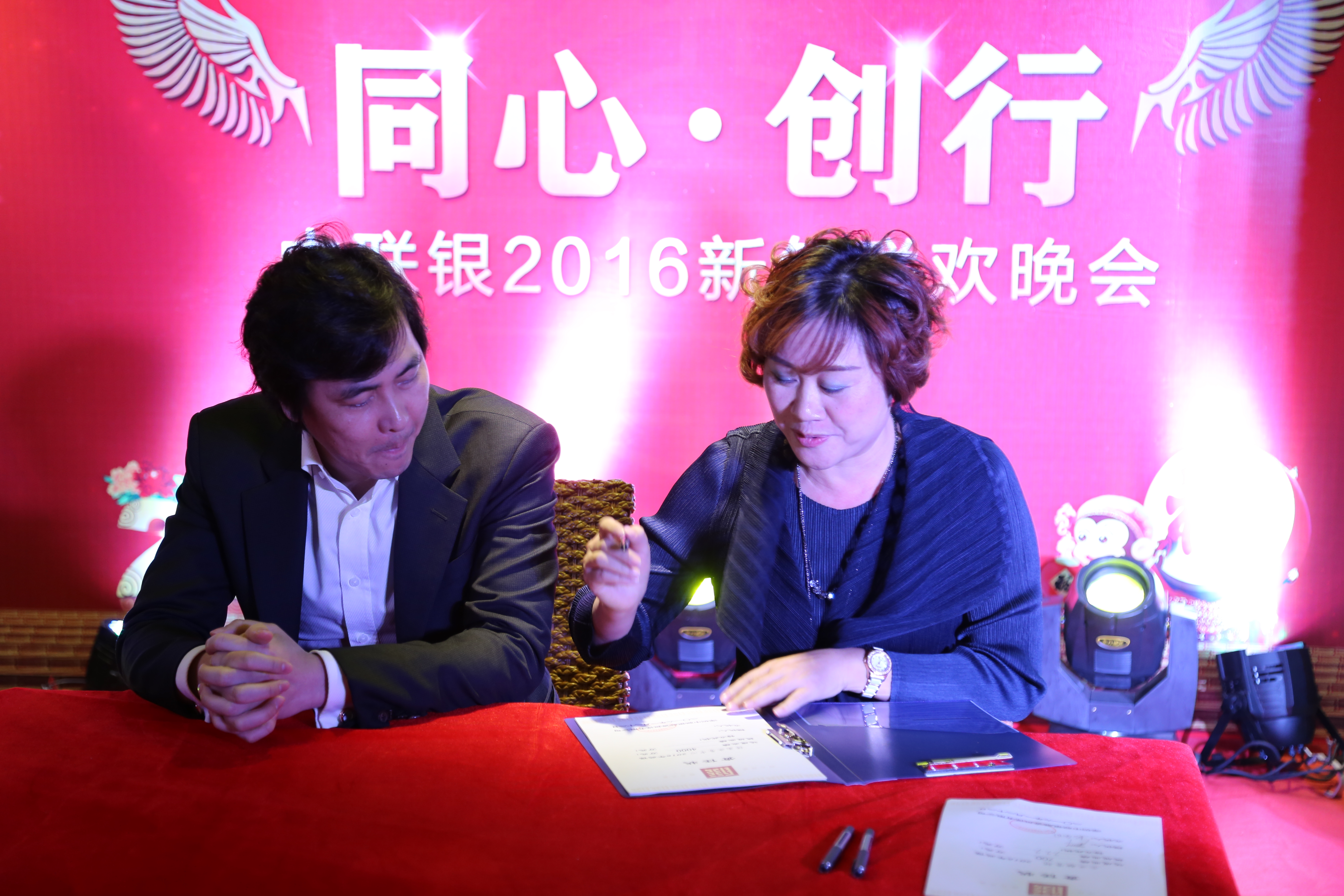 下午,“同心·创行”2016新年联欢晚会在印象横岗文化餐厅举行。同事们纷纷在“同心·创行”签名墙上留下自己的名字并合影留念,中联银“联合之印”LOGO下很快聚集了所有中联银人,象征全体中联银人团结一致,共同开创2016新辉煌。