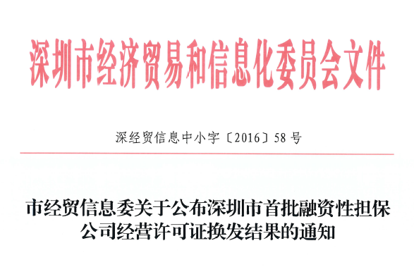 2016年4月5日,深圳市经济贸易和信息化委员会公布深圳市首批融资性担保公司经营许可证换发结果【深经贸信息中小字[2016]58号】: