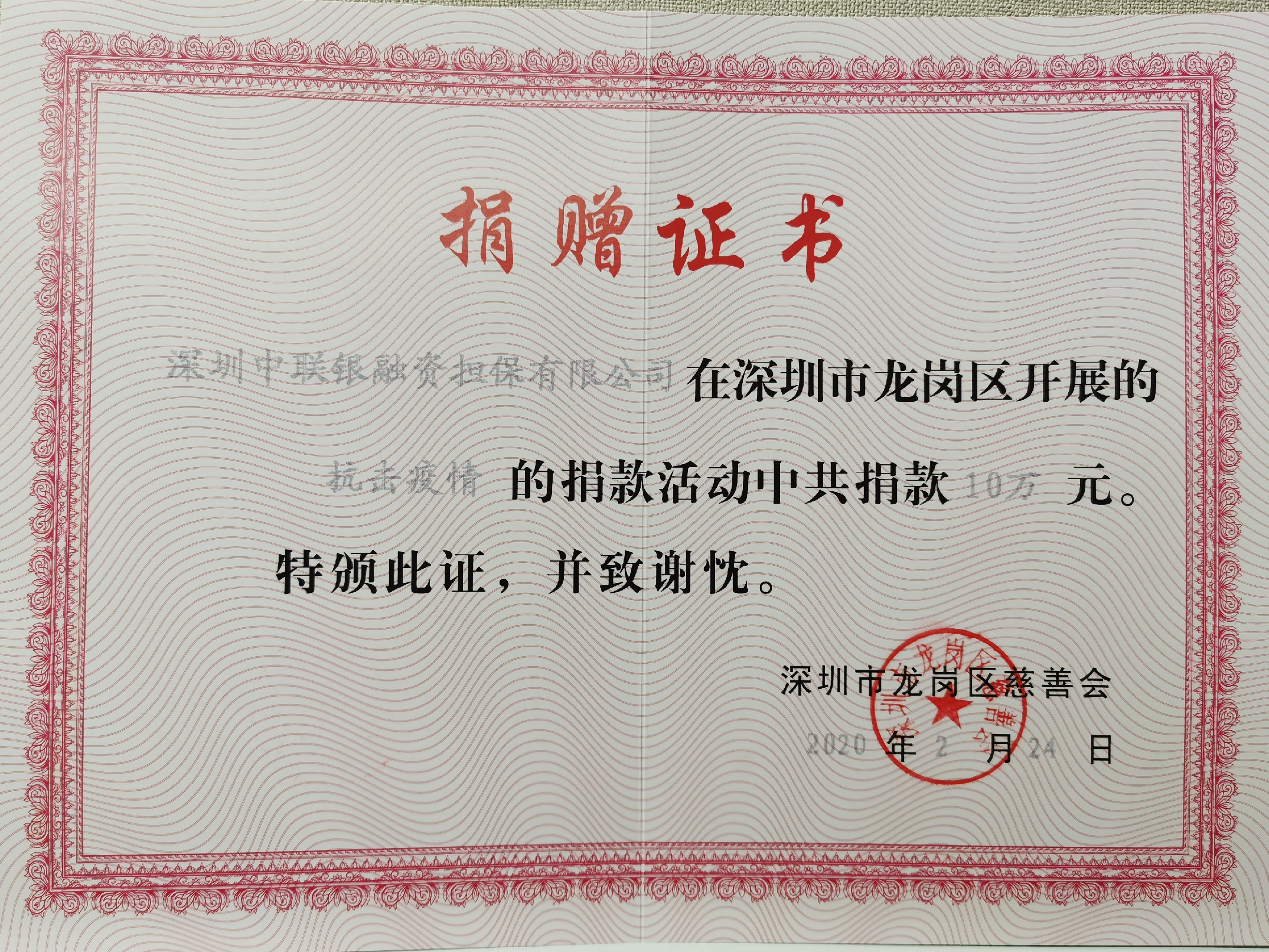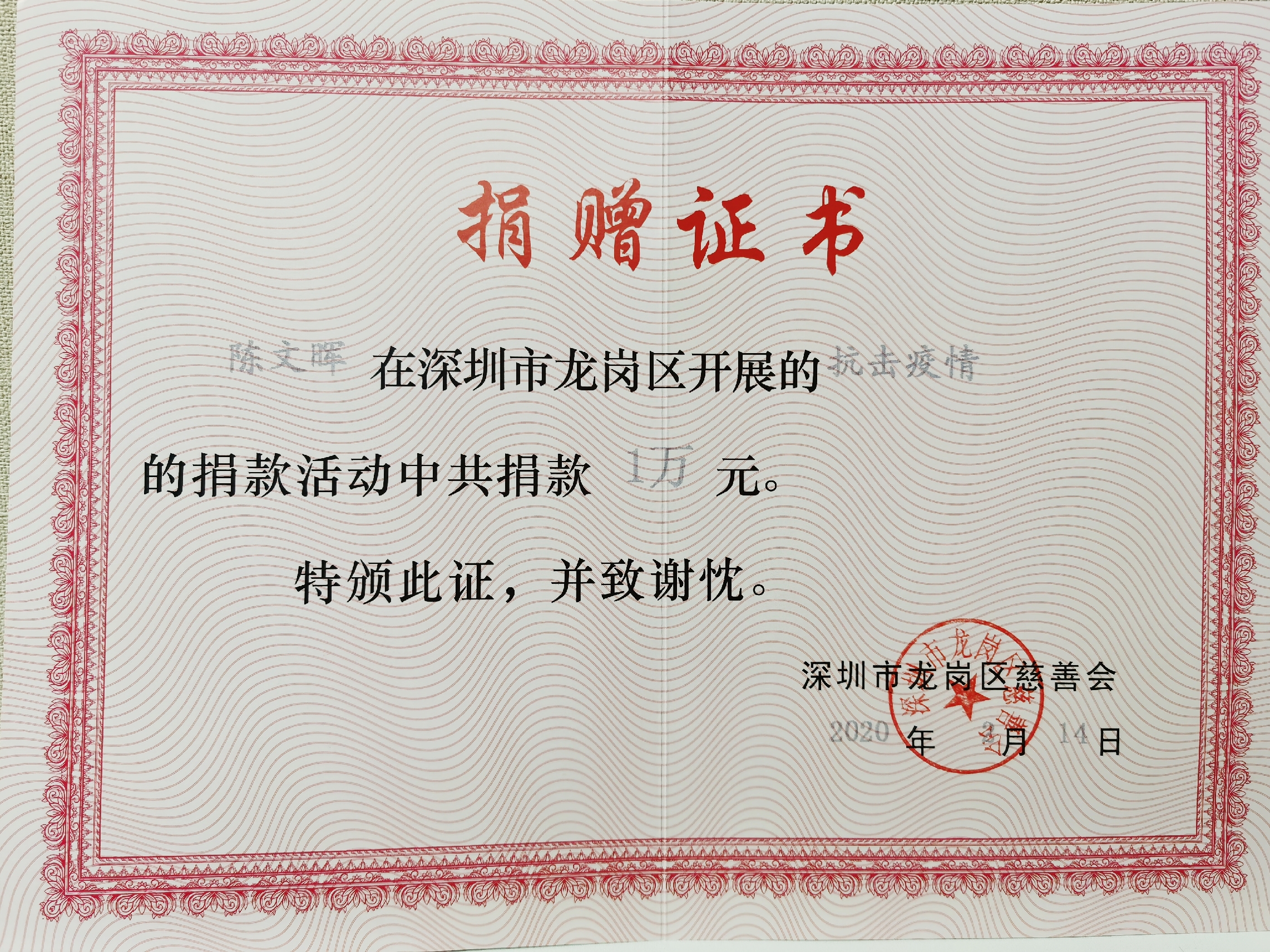 在陆续向横岗街道办捐赠物资的同时,作为龙岗区本土企业,2月24日我司陈文晖董事长代表中联银向龙岗区慈善会捐赠10万元人民币,用于支持新冠状病毒感染肺炎疫情防控资金。