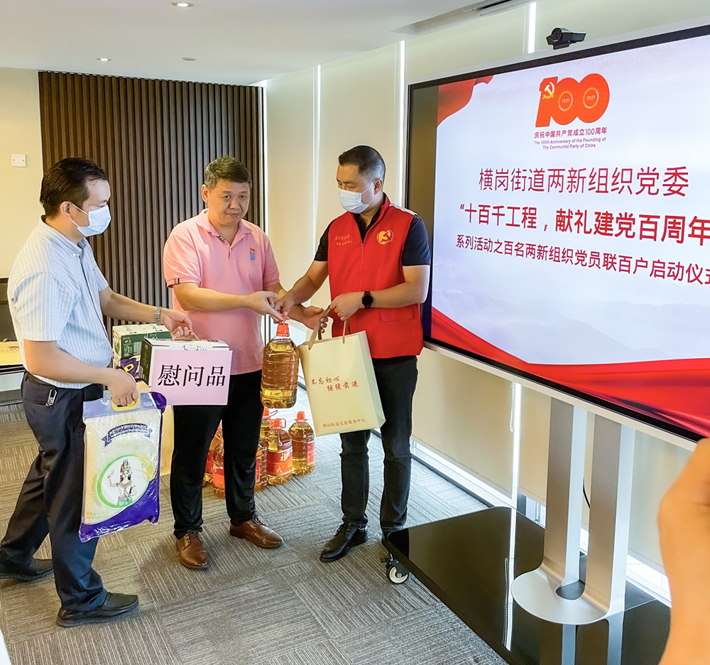 最后,在活动启动仪式上,由横岗街道两新组织党委和我司党支部负责同志共同为党员帮扶对象代表派发慰问品。