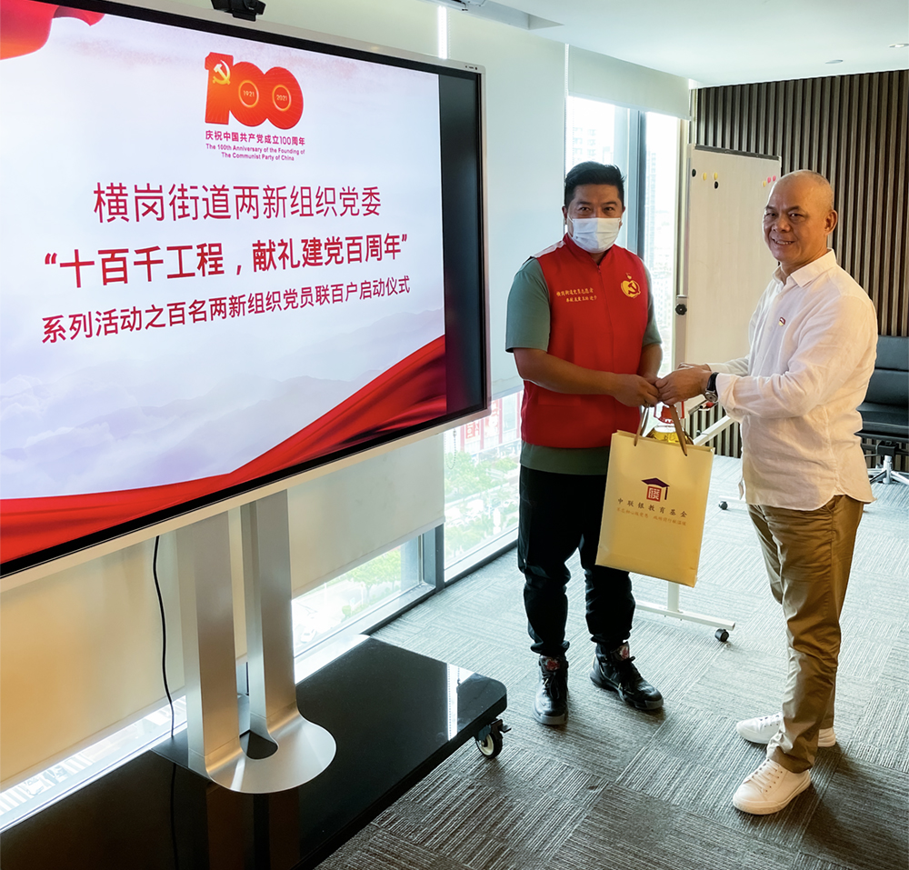 2021年6月30日上午,横岗街道两新党委开展“十百千工程,献礼建党百周年”系列活动之百名两新组织党员联百户活动会议在我司召开。横岗街道两新组织党委副书记、街道党建服务中心主任王琳,副主任胡四民及两新组织党员帮扶对象代表在我司参加活动启动仪式。