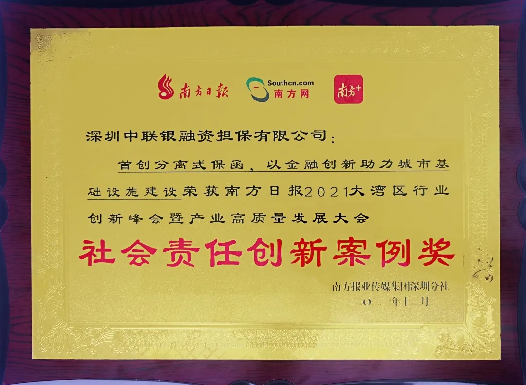 12月17日,南方日报2021大湾区行业创新峰会暨产业高质量发展大会在深圳举办。本会由南方报业传媒集团主办、南方报业传媒集团深圳分社承办,深圳市南山区投资促进中心、深圳市创新企业育成研究院协办。深圳中联银凭借“首创分离式保函,以金融助力城市基础设施建设”荣获南方报业2021大湾区行业创新峰会暨产业高质量发展大会“社会责任创新案例奖”!