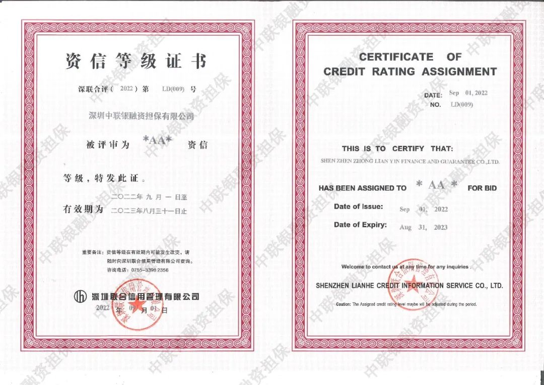 资信等级评定是对企业经营水平、资产状况、履约能力、资信资质等综合实力多维度的全面评价,联合信用管理有限公司先后获得国家发改委、国家工信部、中国人民银行、中国证监会、中国保监会、香港证监会等政府监管部门颁发的所有评级、征信行业相关资质,是中国十大信用评级机构之一、是国际四大评级机构之一,这标志着中联银连续七年良好的经营形象、稳健的财务状况、全面的风险控制能力、广阔的发展前景得到权威评级机构的充分认可,这既是中联银综合实力的最佳证明,也为中联银保函业务的可持续发展提供了重要保障。