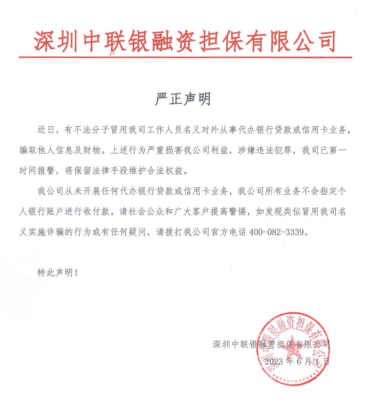 我公司从未开展任何代办银行贷款或信用卡业务,我公司所有业务不会指定个人银行账户进行收付款。请社会公众和广大客户提高警惕,如发现类似冒用我司名义实施诈骗的行为或有任何疑问,请拨打我公司官方电话:400-082-3339。
