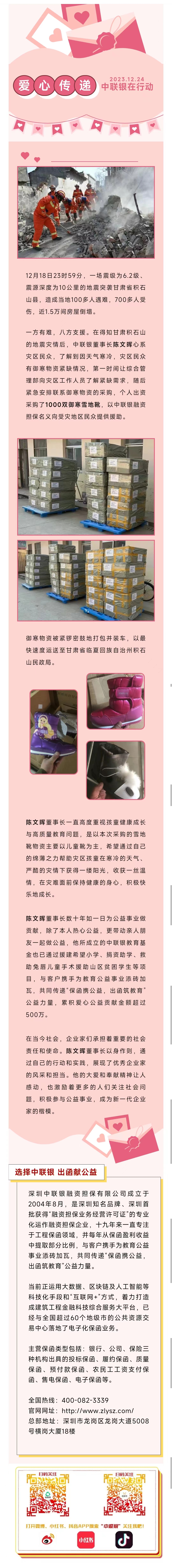 弘扬大爱·援助甘肃丨中联银董事长陈文晖向灾区捐助防寒物资
