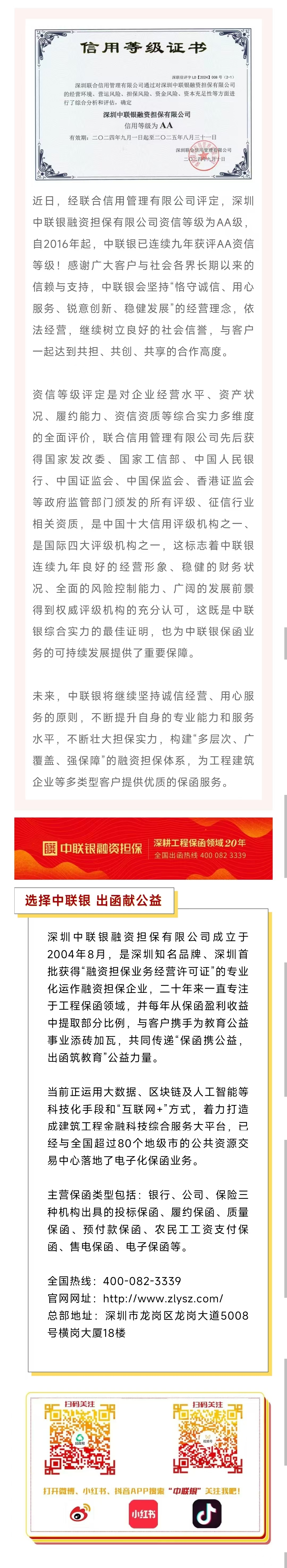 中联银连续九年获评AA资信等级