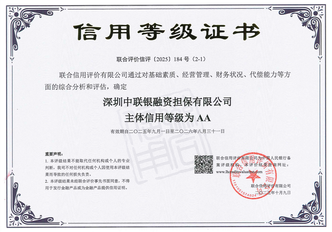 "人无信不立,业无信不兴"。中联银成立二十年以来始终将"诚信"二字镌刻在企业发展旗帜之上。这份执着,体现在每一份保函的严谨出具中,体现在每一次服务的精益求精里,更体现在与客户并肩同行的每个日夜里。我们深知,诚信不仅是市场的通行证,更是与客户建立深厚情谊的基石。感谢时代赋予的机遇,感恩客户长久以来的托付,让中联银有机会参与一个个重大工程的建设,推动我们不断突破自我、追求卓越。这份十年如一日的AA评级,既属于中联银,更属于每一位与我们携手同行的伙伴。