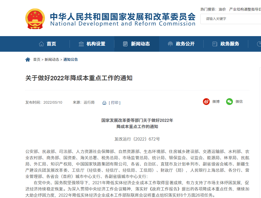 5月10日,发改委发布“国家发展改革委等部门关于做好2022年降成本重点工作的通知[发改运行〔2022〕672号]”其中: