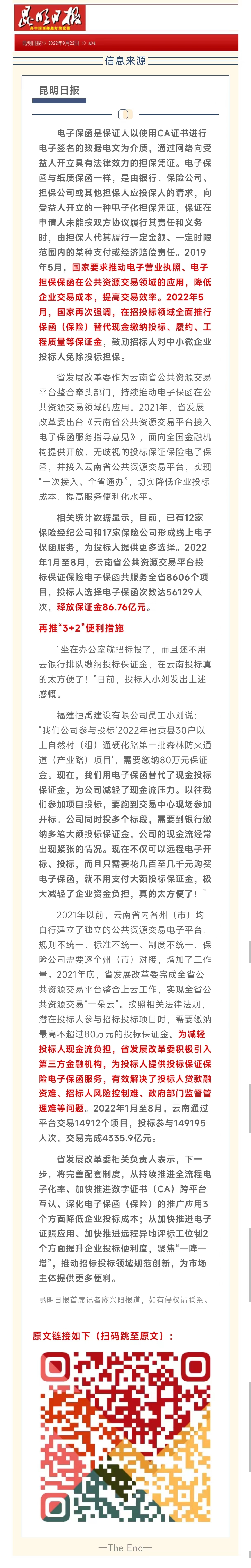 云南持续优化公共资源交易领域营商环境丨“12+17”电子保函服务释放保证金超86亿元