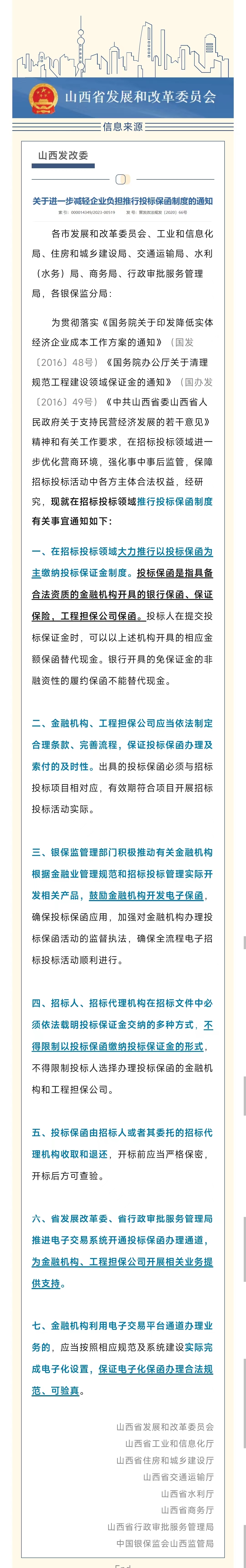 山西省发改委等8部丨关于进一步减轻企业负担推行投标保函制度的通知